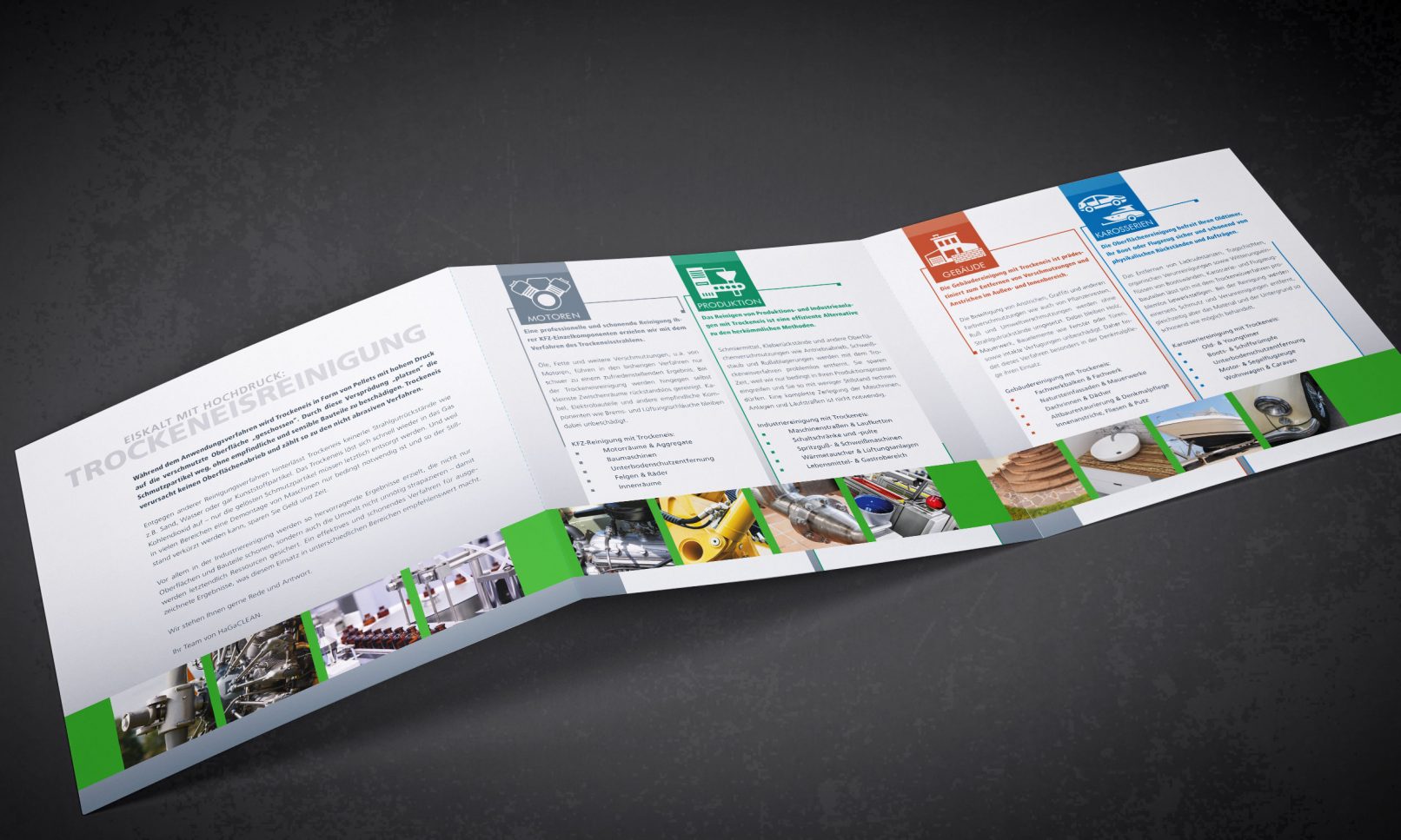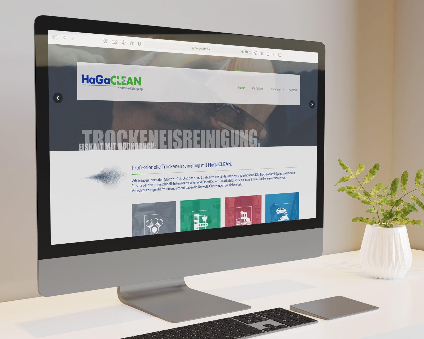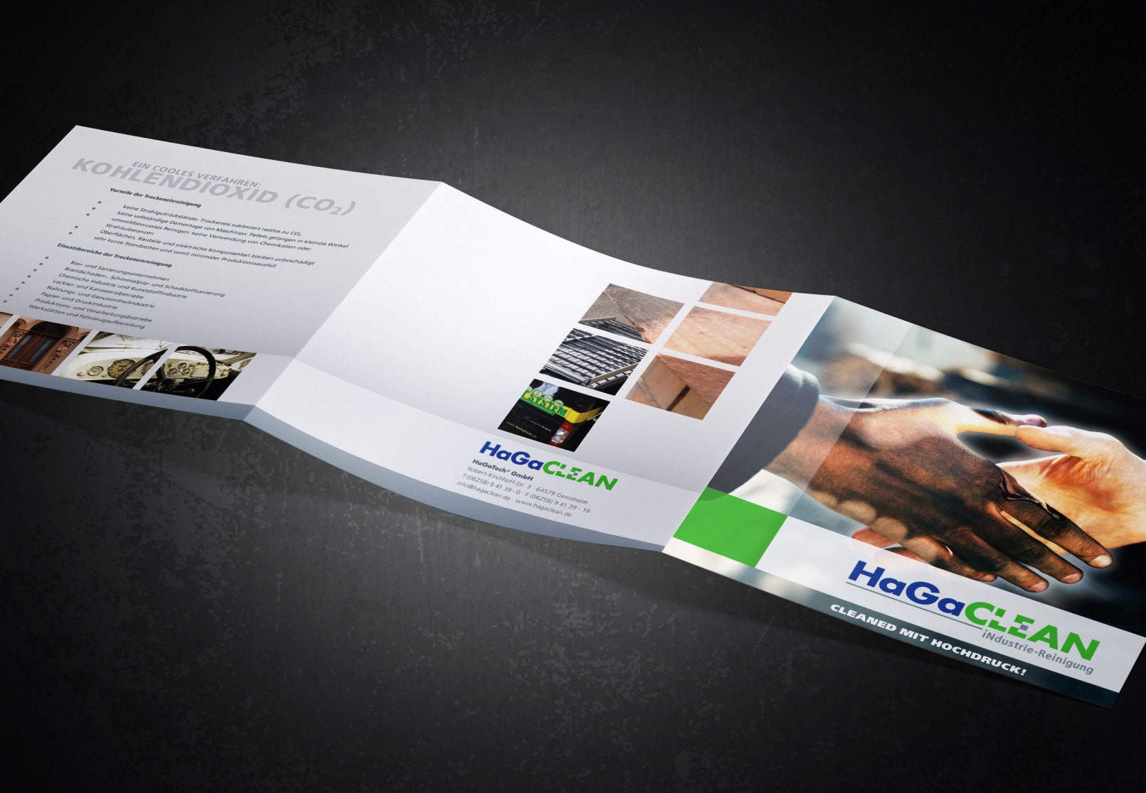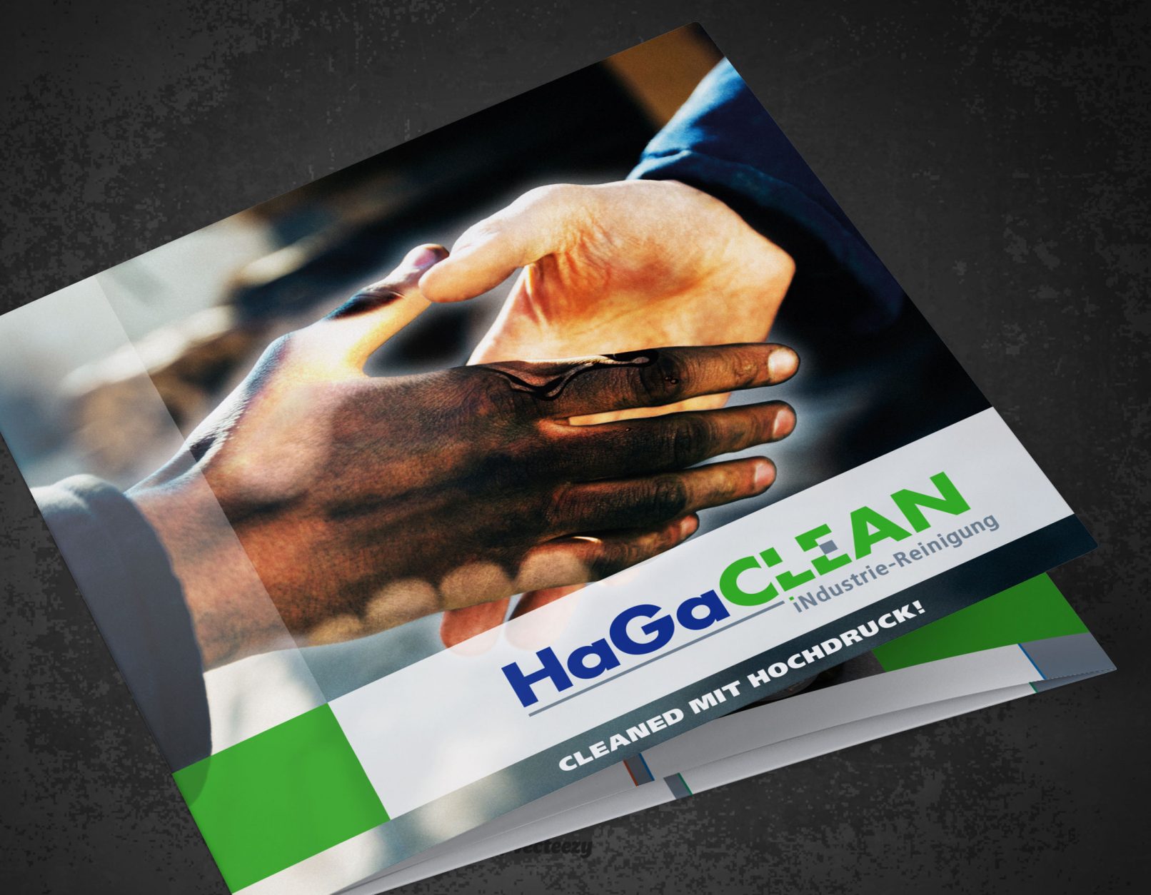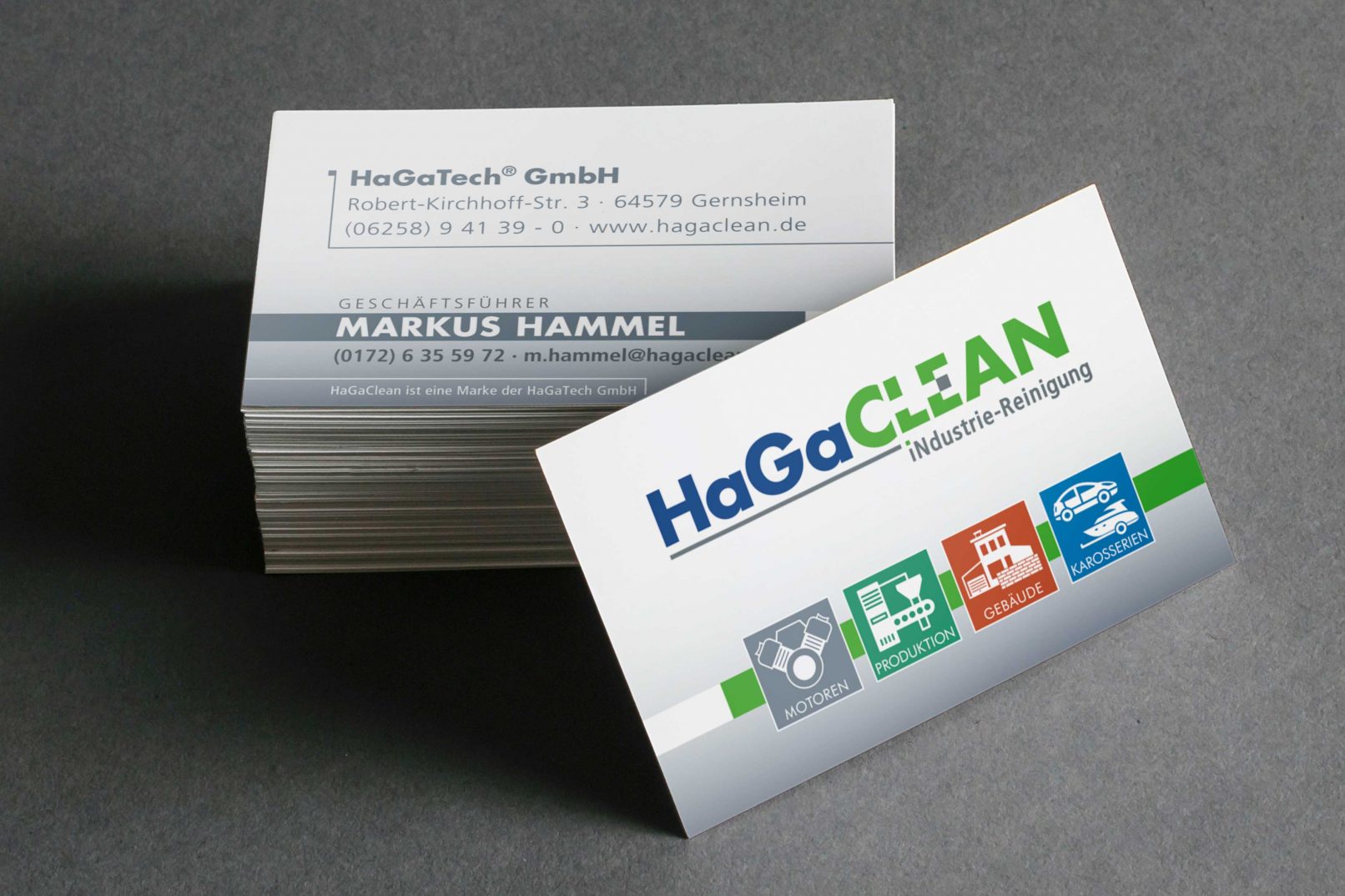 HaGaCLEAN, eine Tochter der HaGaTech GmbH, bietet Industriereinigung mit Trockeneis an. Dieser Reinigungsvorgang wurde von mir in der Logoentwicklung berücksichtigt und zeigt sich mit dem ausgesparten „L“ und „E“. Um die Zusammengehörigkeit der beiden Unternehmen zu zeigen, ist auf die gleiche Umsetzung der Typografie zurückgegriffen worden.