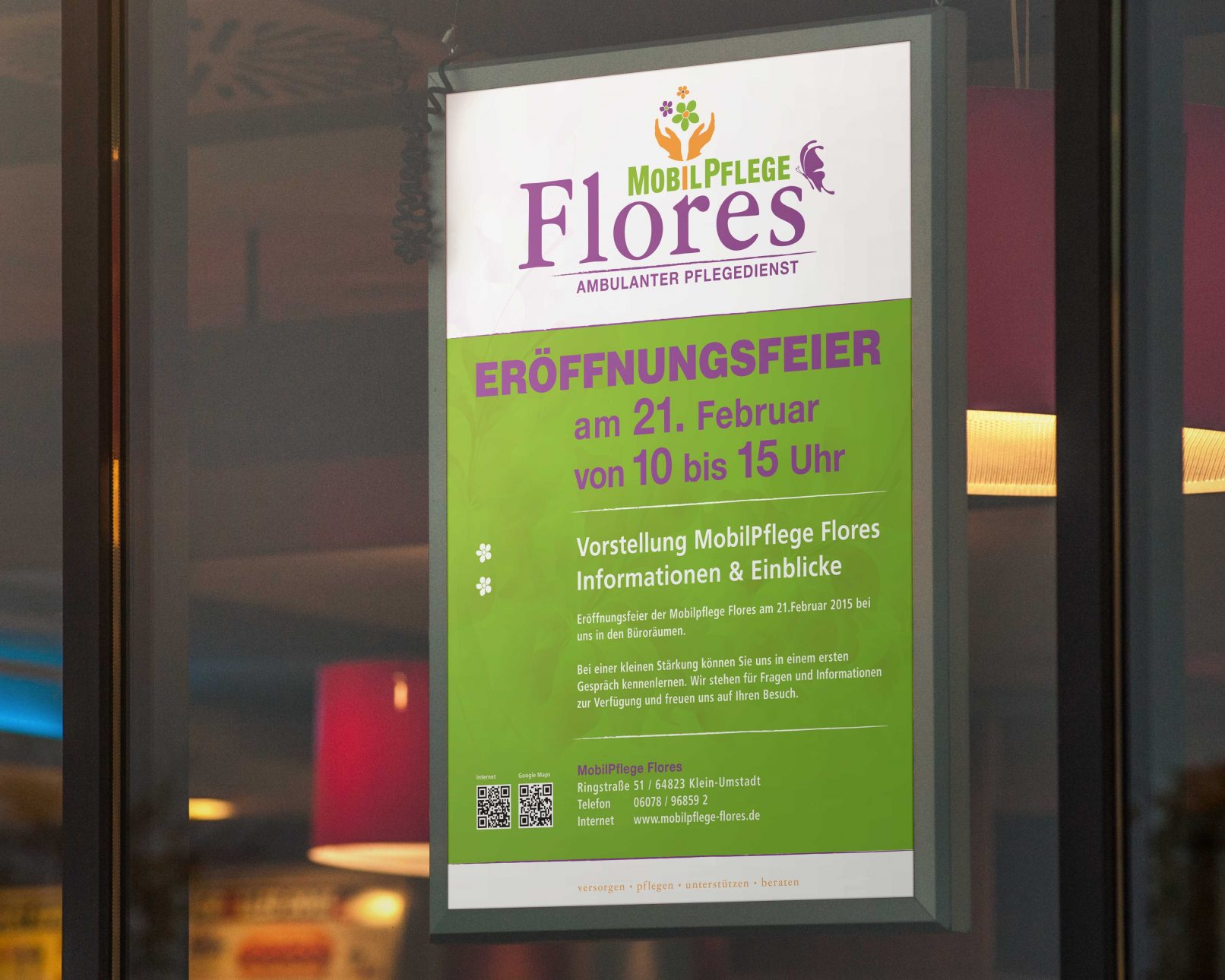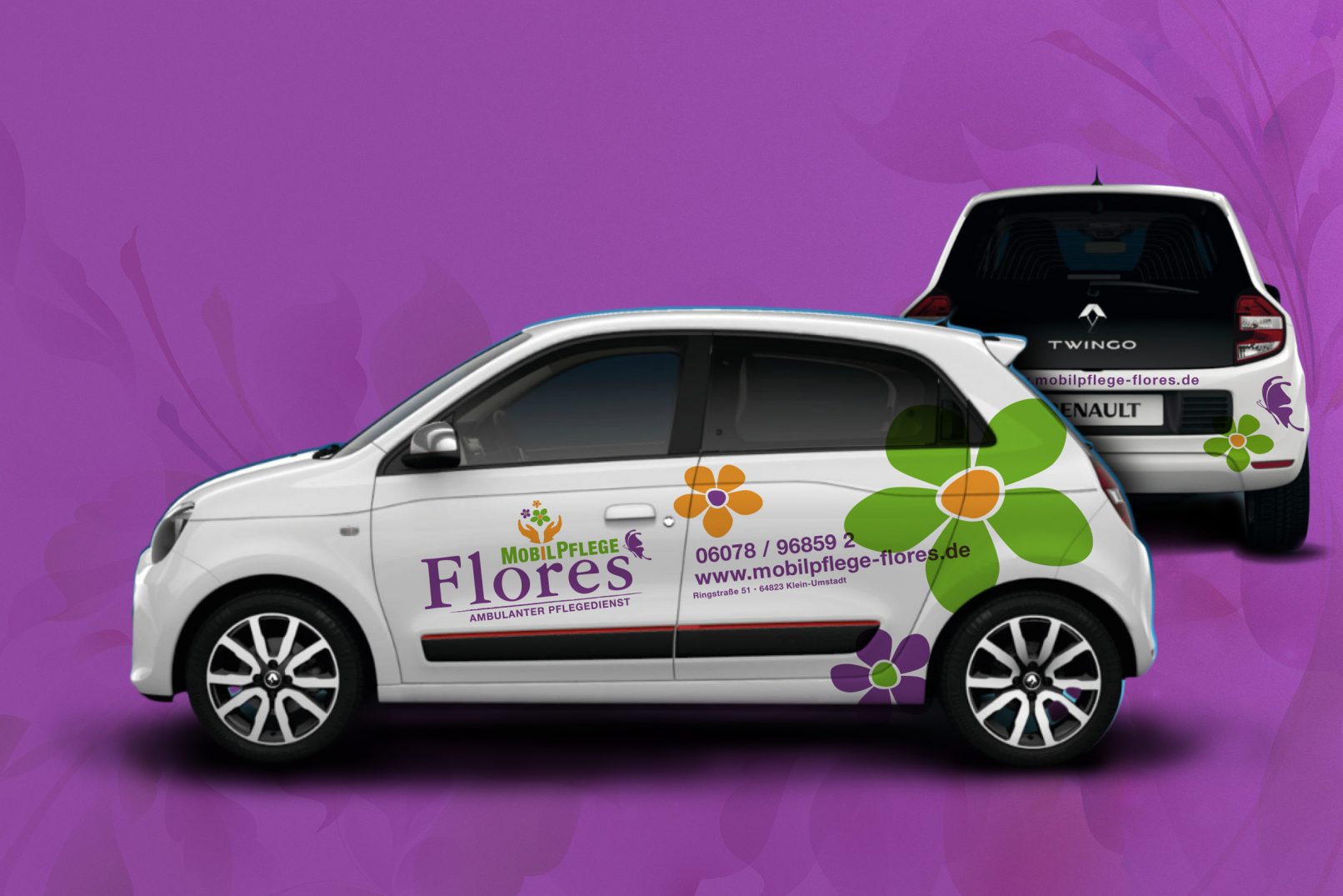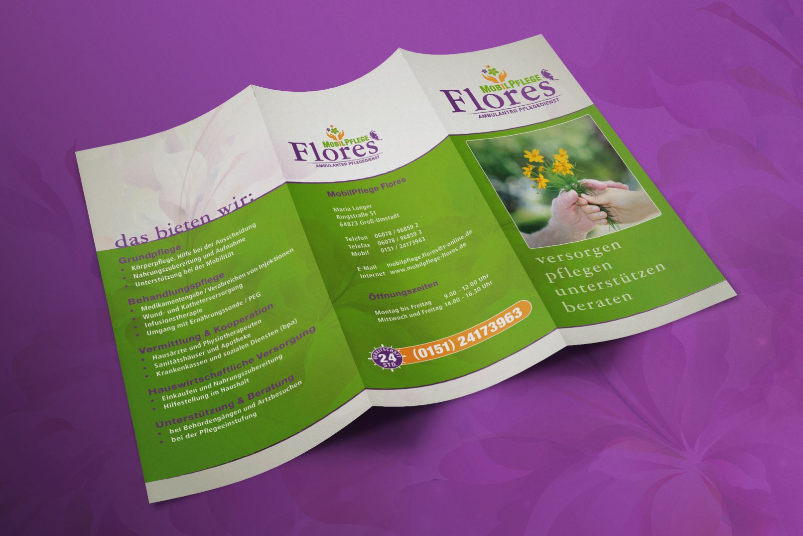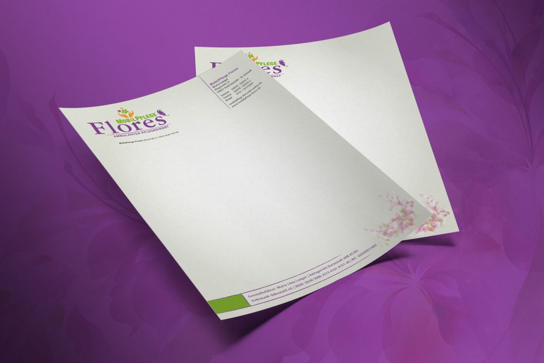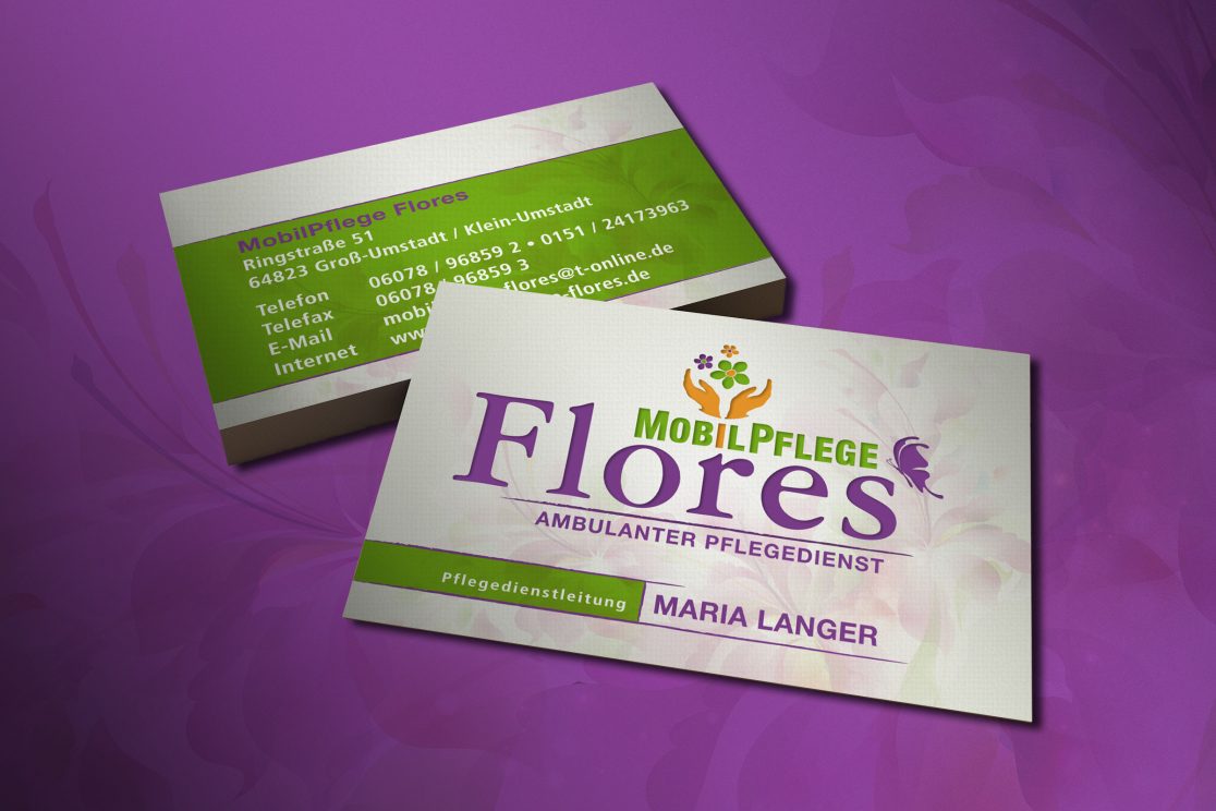 Flores: der Name ist Programm. Es sollen Blumen zu sehen sein und gebende Hände und die Typo Mobilpflege mit einem erklärenden Claim darf natürlich auch nicht fehlen und ein Schmetterling wäre auch schön …