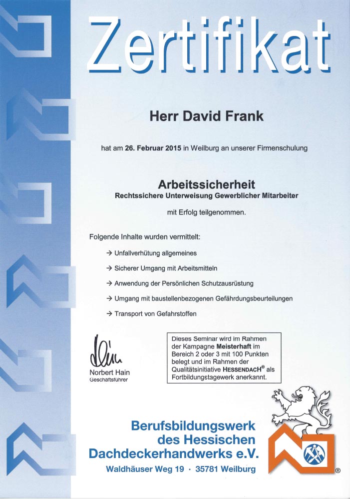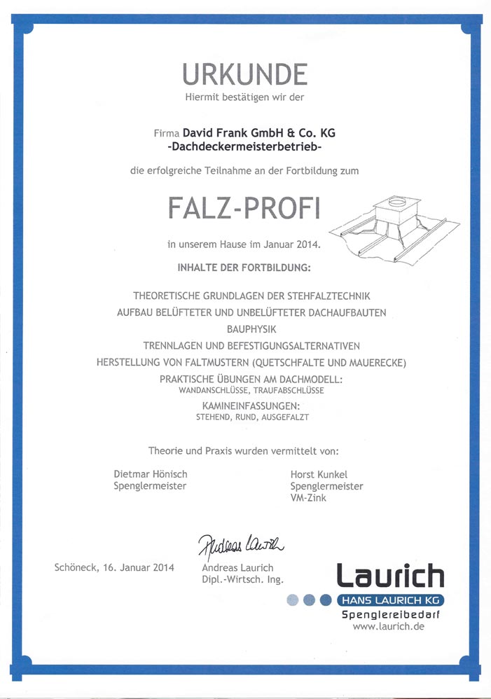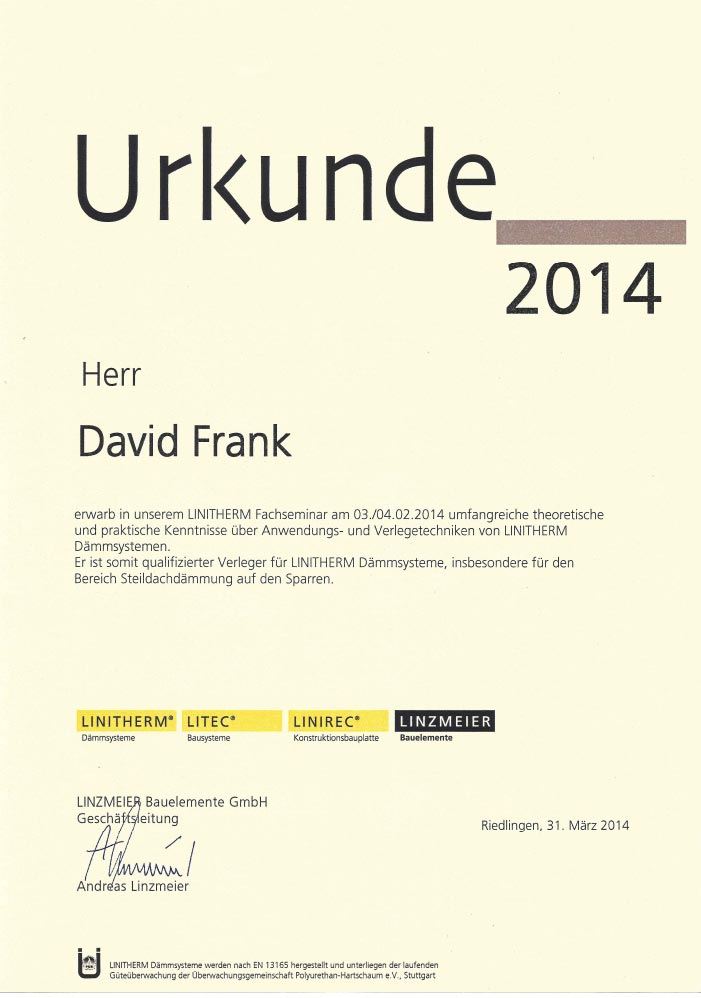 Wir legen seit der Gründung der David Frank GmbH & Co. KG großen Wert auf eine fortwährende Weiterbildung unserer Mitarbeiter. So erweitern wir permanent unser Kenntnisspektrum und stehen damit neuen Entwicklungen sachkundig gegenüber.