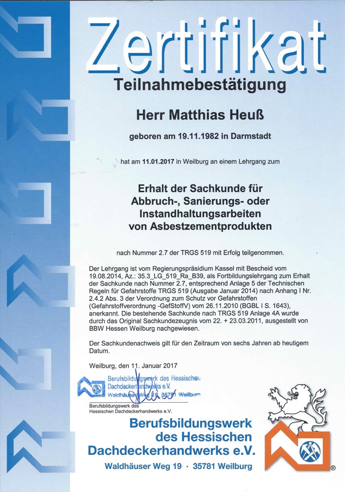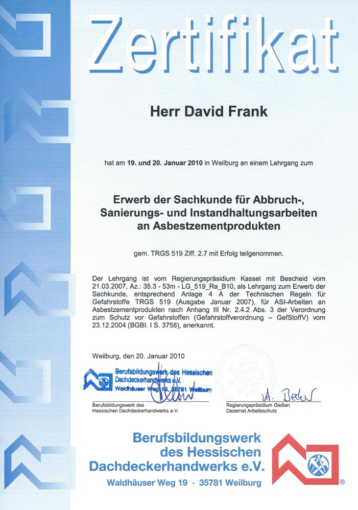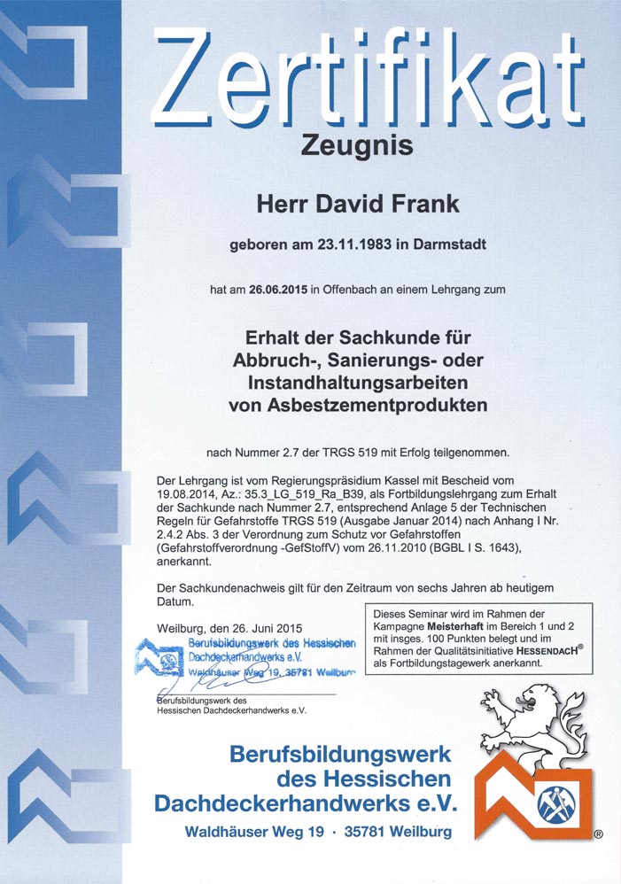 Erwerb der Sachkunde für Abbruch-, Sanierungs- und Instandhaltungsarbeiten an Asbestzementprodukten
